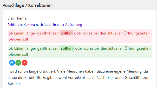 Das Sprachprüfungsmodul hat nun eine deutlich verbesserte User Experience bei der Bearbeitung von Korrekturen mit Inline Bearbeitung von Korrekturvorschlägen und graphisch stark verbesserter Hervorhebung von Änderungen.